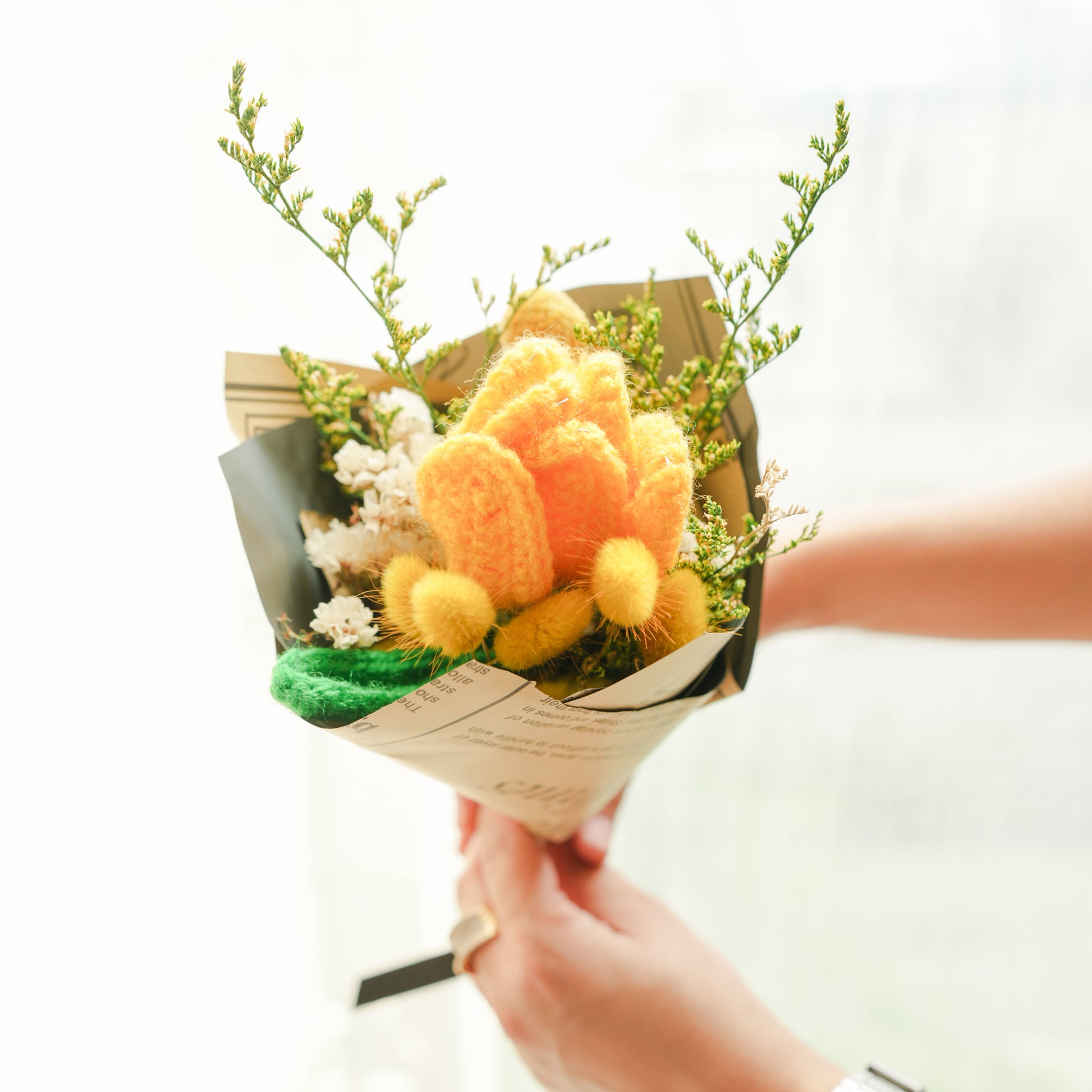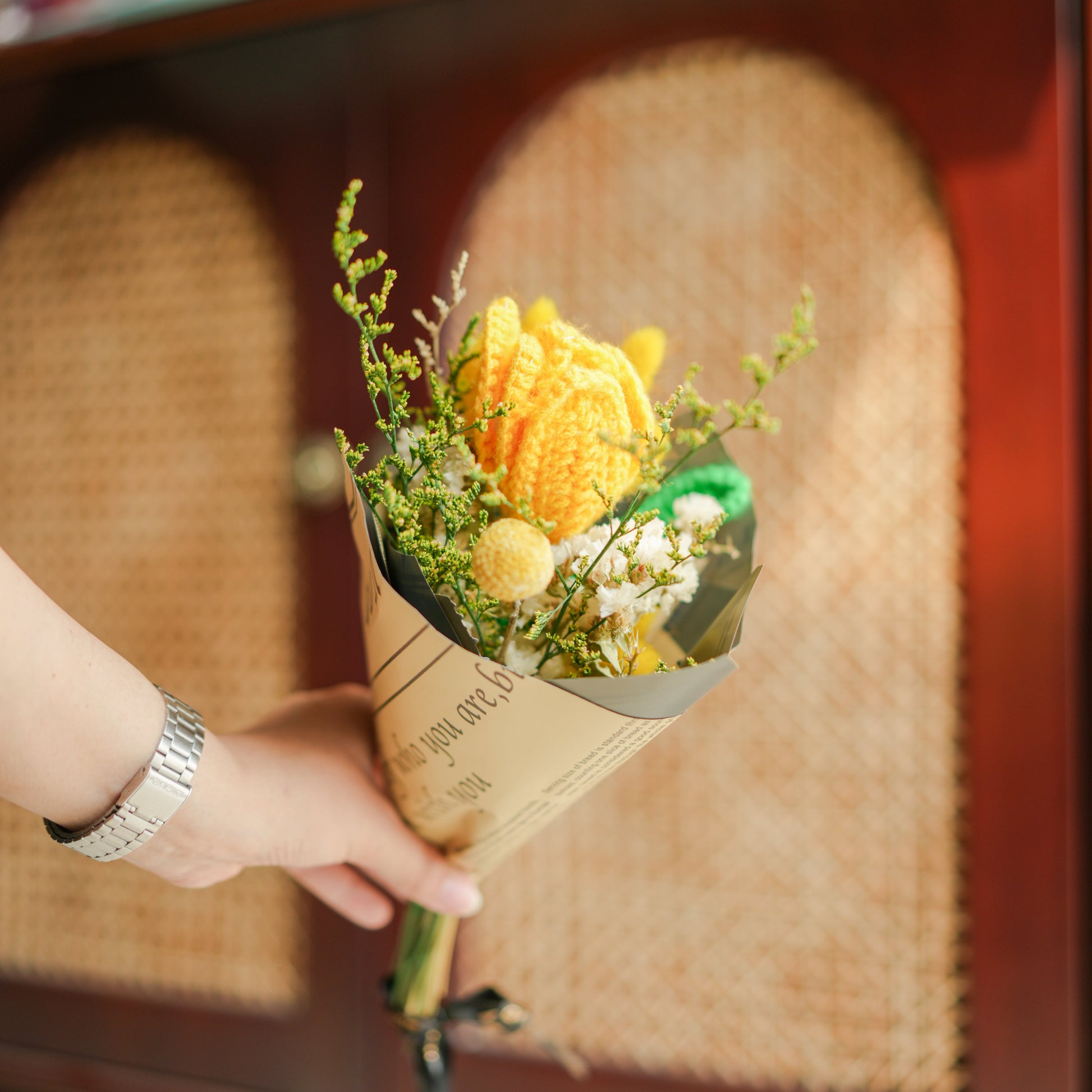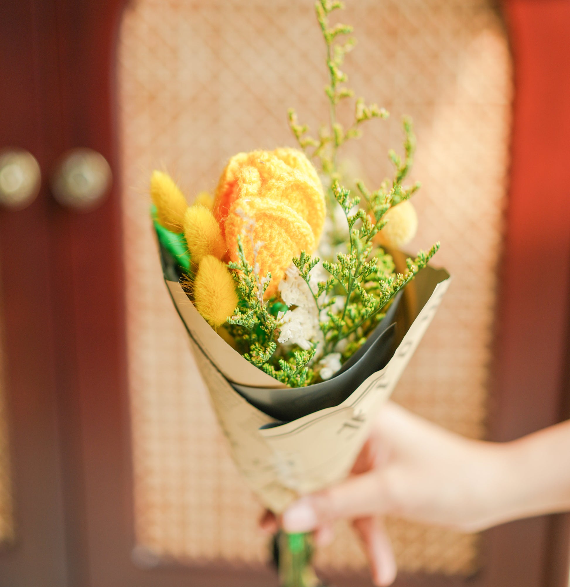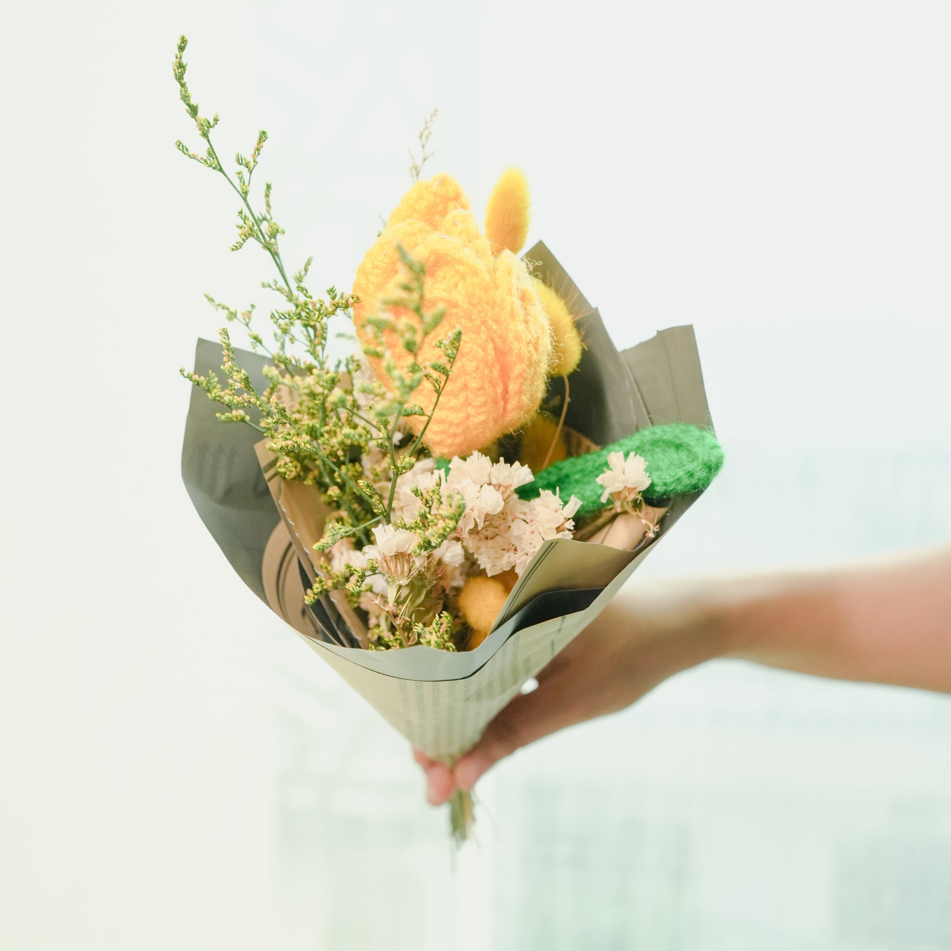 Yellow Crochet tulip with dried flower bunch
